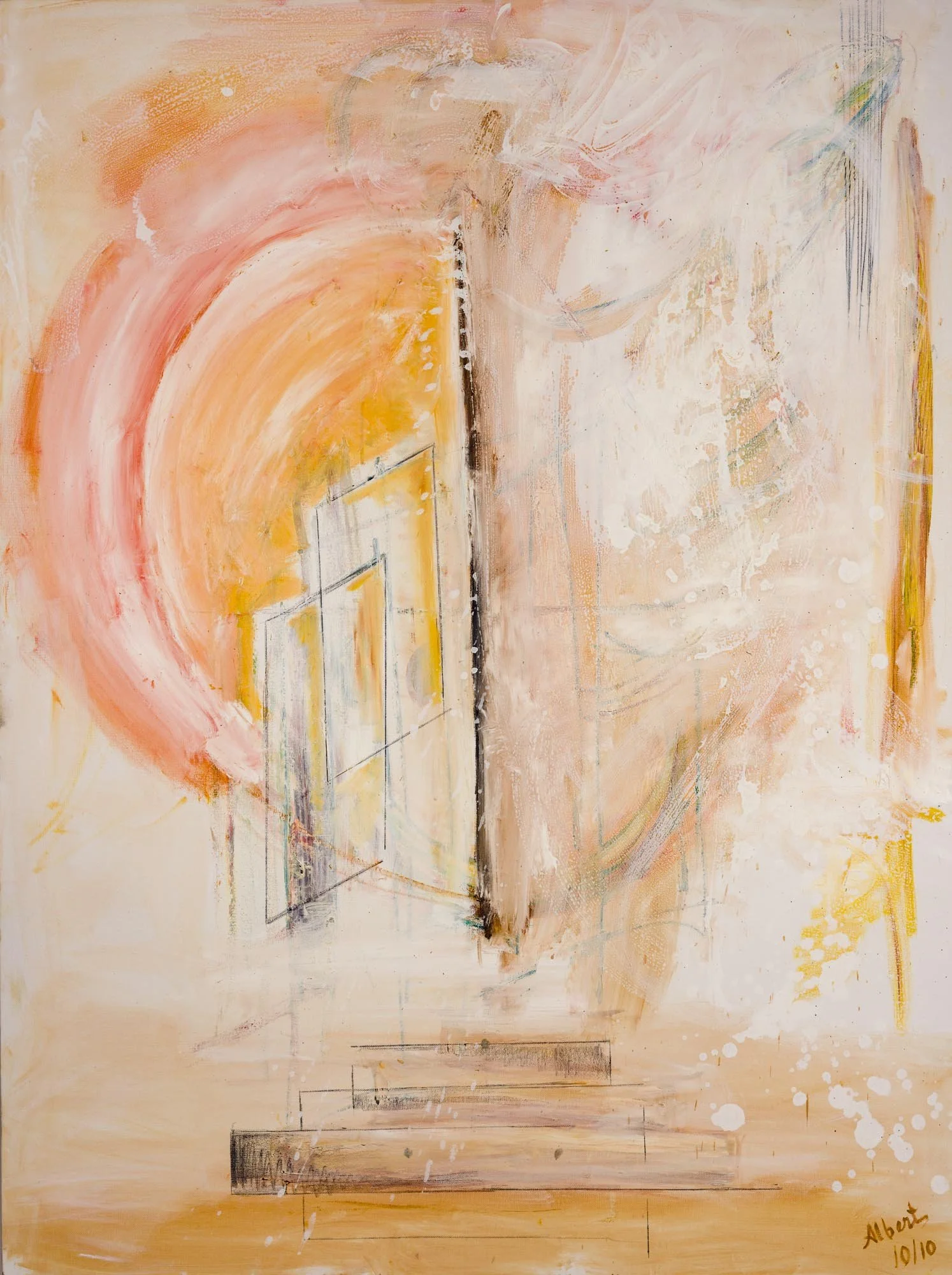 One must climb the steps and rise from one world to the next in the presence of our secondary sun. Physically and mentally one must enlighten oneself. The crown on the top of the painting resembles all that is All. I will leave to your imagination the white movement on the right of the painting. You will see and once you do your heart will smile.